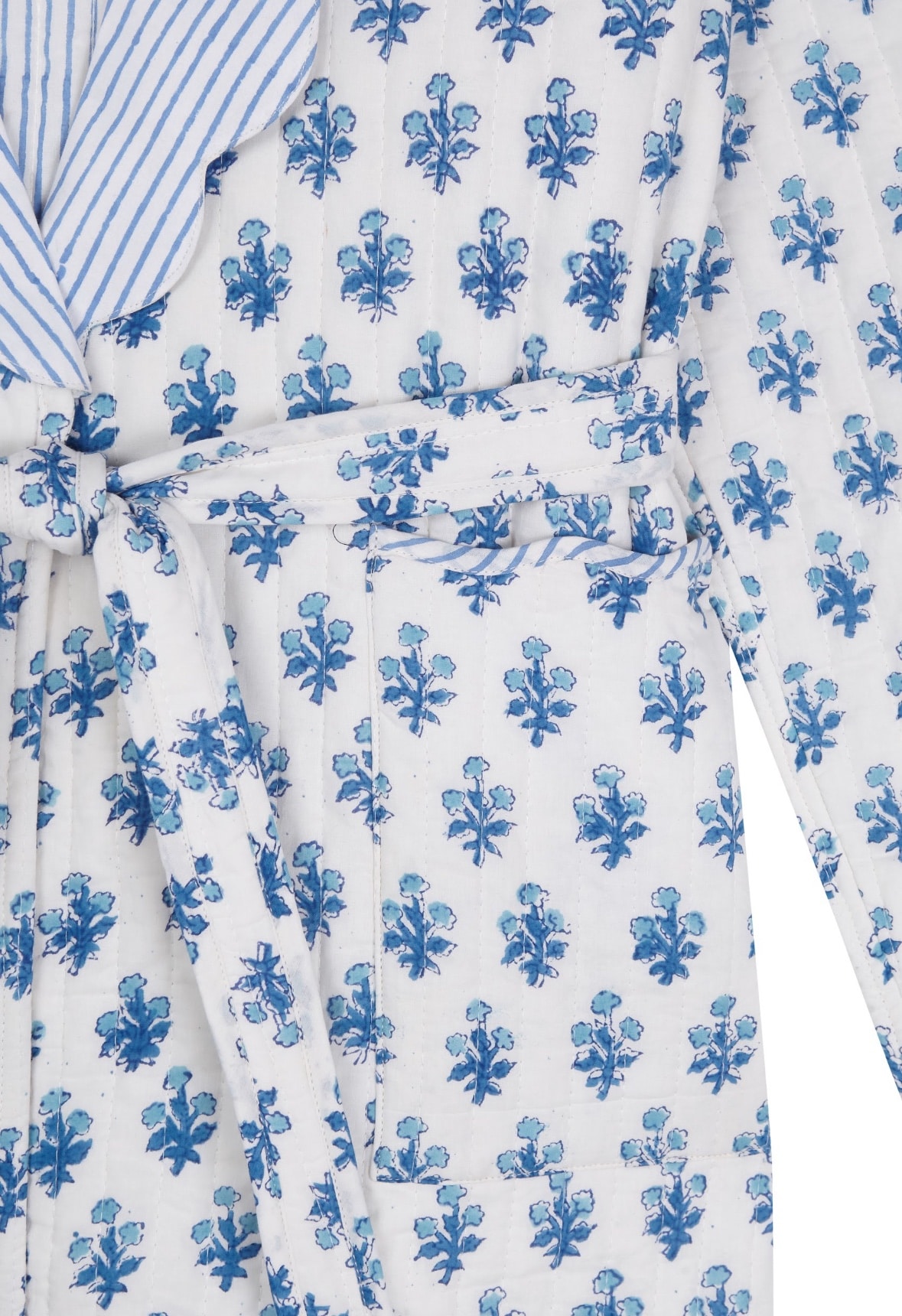 Bata guateada con estampados hand block print. Interior forrado con estampado mil rayas a contraste. Incluye cinturón a juego y doble bolsillo delantero con bies en ondas a contraste.
